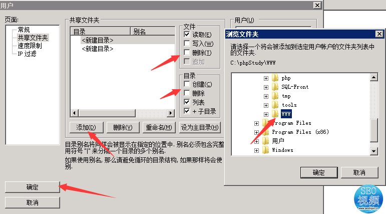 在Windows服务器上安装使用FTP远程管理工具,点击“其他选项菜单-其他高级应用-FTPServe管理器”即可打开下载链接。 https://video.randengseo.com/8cf4e3devodcq1300403359/79d87160387702294751459297/0Lf0TlQMgMIA.mp4 那怎么使用这个开启ftp功能,进行设置呢?windows 服务器phpstudy ftp server设置: 1、打开FTP server工具,点击“编辑-用户” 2、添加一个ftp用户,填写用户名 3、设置ftp密码 4、设置ftp用户管理的文件夹及权限,点击添加,就会打开小窗口,选择要管理的文件夹,确定后,再勾选这个ftp账户的管理权限
